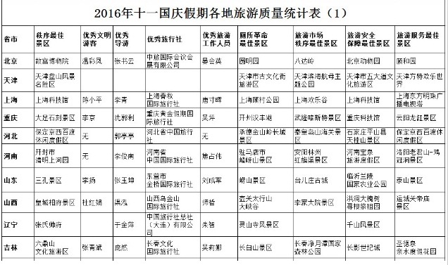 2016年國慶假日在歡樂祥和中落幕。七天長假,5.93億人次出游,無重大糾紛事件,無重特大安全事故報告。平穩(wěn)有序的旅游市場背后,離不開各級旅游主管部門、經(jīng)營單位和廣大旅游人的共同努力。10月9日,國家旅游局發(fā)布十一假日旅游“紅黑榜”,集中表揚一批最佳景區(qū)、優(yōu)秀旅行社、優(yōu)秀導游、優(yōu)秀旅游工作人員和文明游客,同時也對假日期間廁所革命滯后、環(huán)境臟亂、管理混亂、服務惡劣的旅游經(jīng)營單位和從業(yè)人員以及不文明游客進行了曝光。