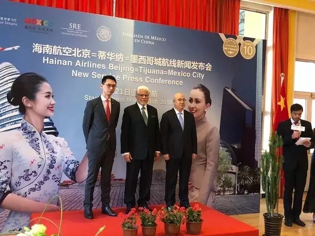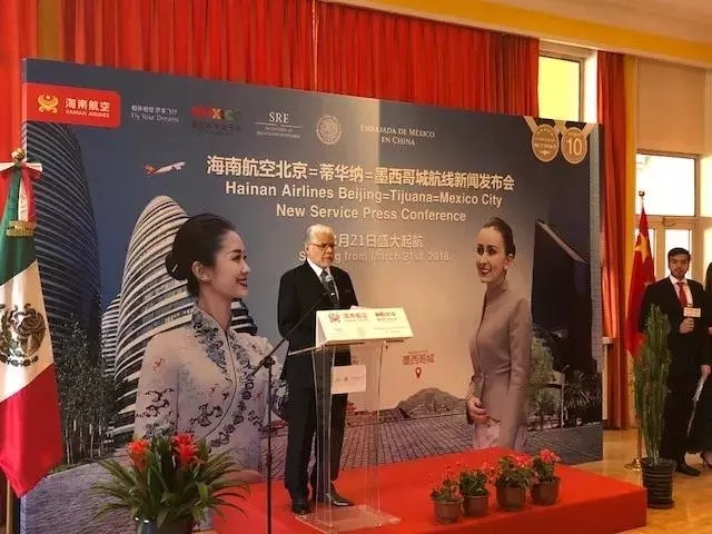 2018年2月2日,北京-蒂華納-墨西哥城直航航線新聞發布會在墨西哥駐中國大使館舉行。發布會上,海南航空宣布啟動由中方運營的墨西哥與中國之間的首個直航航班。該航班將于3月21日盛大起航,每周三班,由波音787承載北京經停蒂華納再達墨西哥城。海南航空市場營銷副總裁劉吉春先生、北京首都國際機場副總經理杜強先生、中華人民共和國外交部拉美及加勒比司分管墨西哥事務的副處長湯慶治女士出席了本次活動。