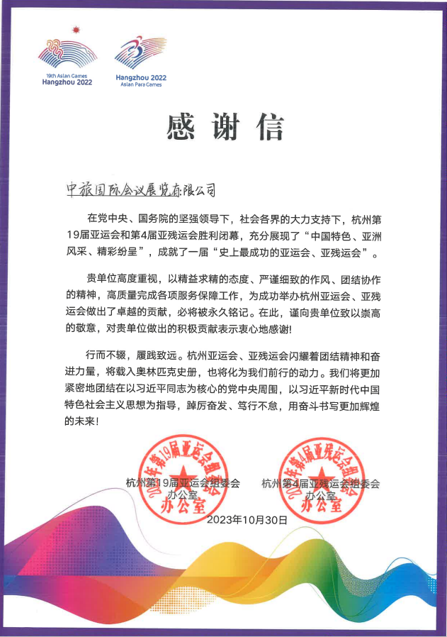 近日,中旅旅行所屬中旅會展喜獲杭州第19屆亞運會組委會及第4屆亞殘運會組委會聯名感謝信。信中對中旅會展精益求精的態度、嚴謹細致的作風、團結協作的精神及各項服務保障工作的高質量完成表示充分贊許,并對中旅會展團隊為杭州亞運會、亞殘運會成功舉辦所做出的卓越貢獻與辛勤付出表示衷心感謝。